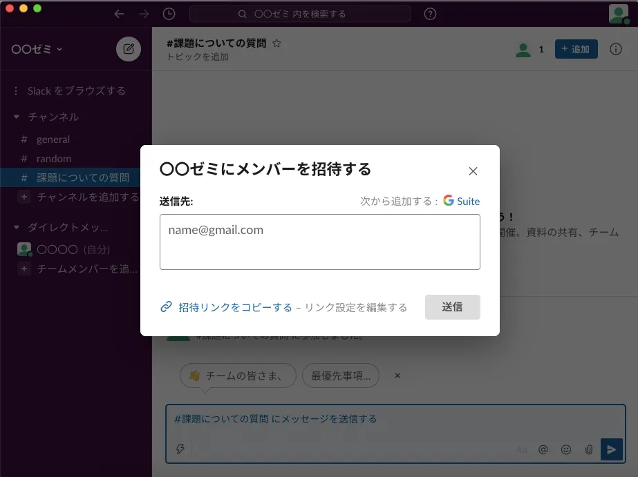 - リンクで共有する場合は,招待リンクをUTOLなどを通じて授業内で共有します(「招待リンクの共有方法(Slackヘルプ)」).