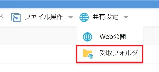 2. 一覧の上部に表示されている「共有設定」を選択して「受取フォルダ」を押してください.画面サイズによってはアイコンのみが表示されます.