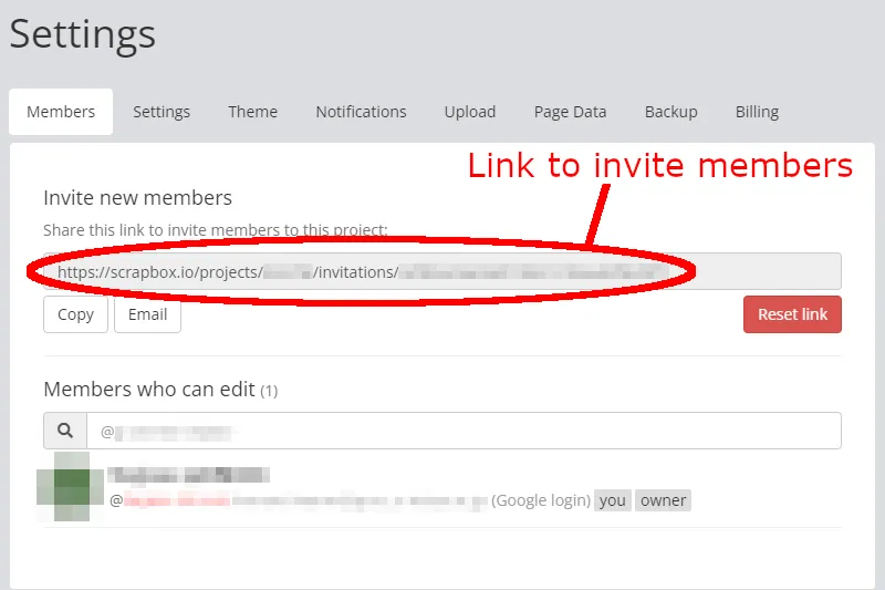 - Members: Allows you to add people to your project by sharing the link shown here.