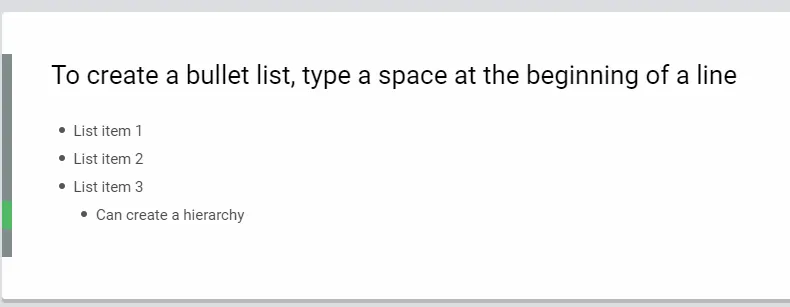 By typing a space at the beginning of a line, you can create a bullet list; pressing Enter will automatically move to the next bullet list. If you want to stop bulleting, press the Enter key twice.