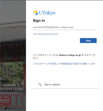 • You cannot sign in with UTokyo Account on this sign-in page. If you see this screen even though the system supports signing in with UTokyo Account, please contact the support desk.