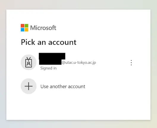 • Select the displayed account name and follow the on-screen instructions to sign in. Depending on the situation, you may be asked to confirm your identity with multi-factor authentication (MFA) or be redirected to the sign-in page with the image of Yasuda Auditorium. For detailed sign-in instructions, please refer to “Sign in to the ICT systems with your UTokyo Account.”