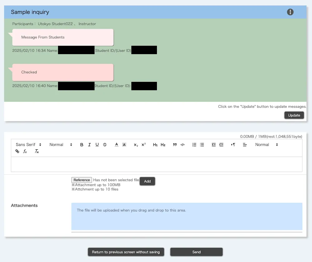 To check new messages received while on this screen, click the “Update” button at the top of the screen. - To reply, compose your message, add attachments if needed, and click “Send”.