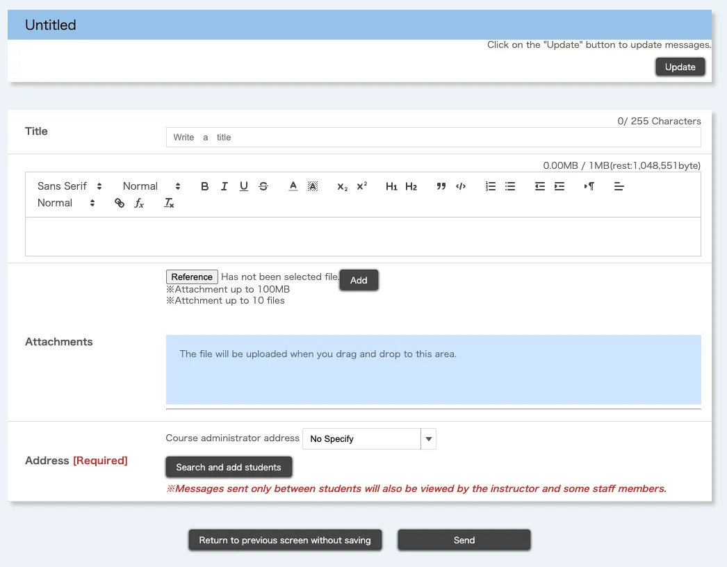 - If you select “No Specify” for the course administrator recipient, messages will be exchanged only among students. Please note that in this case, course instructors and TAs cannot join the conversation, but course instructors can view the messages. Also, when selecting “No Specify”, you must add at least one enrolled student as a recipient.