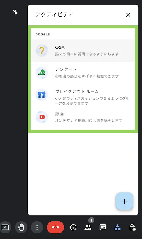 ライセンスが付加されているかどうかは,Google Meetのアクティビティ機能の利用可否から確認できます.なお,アクティビティ機能は,学生向けと教職員向けのいずれもで利用可能なものです.