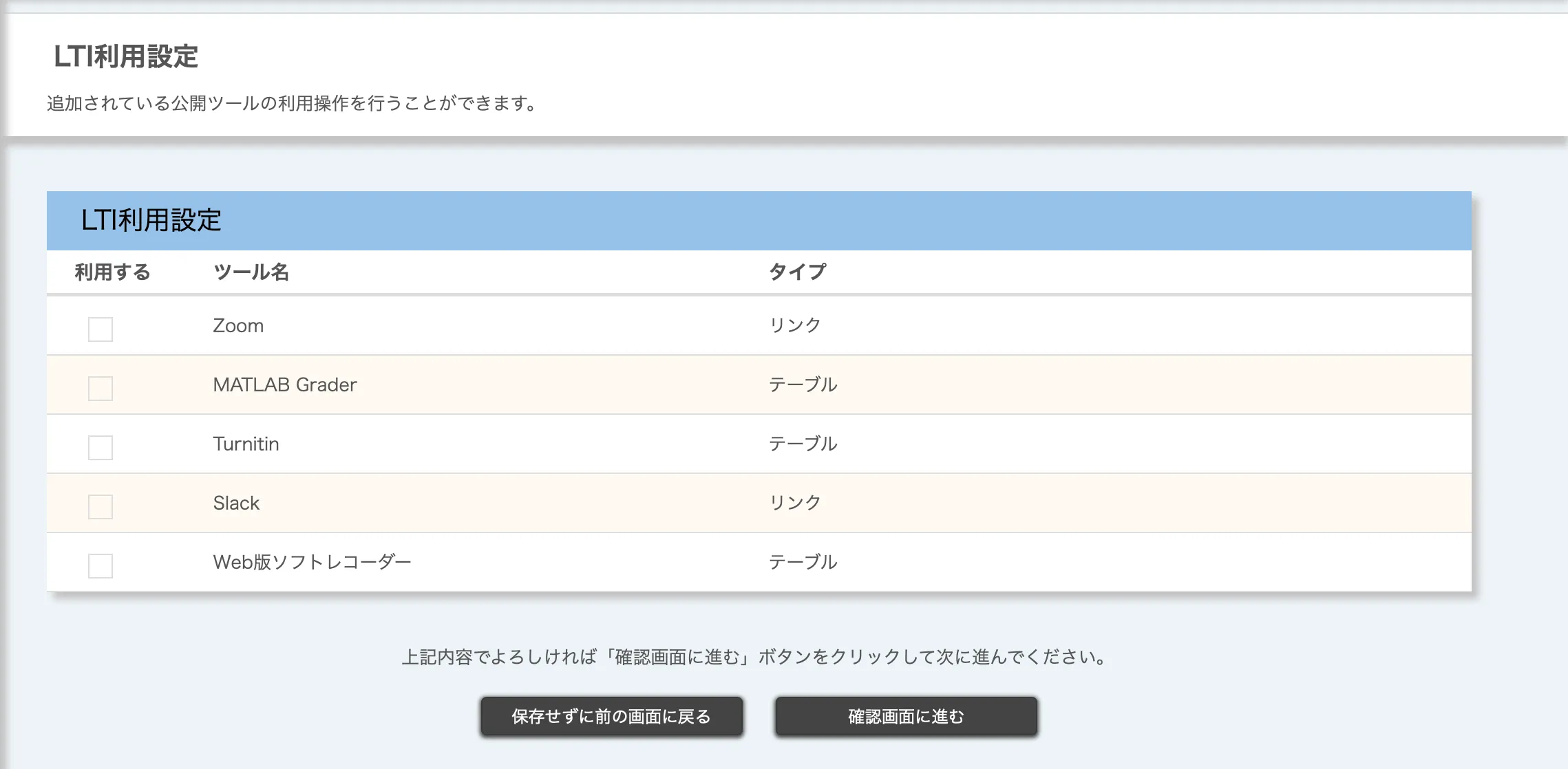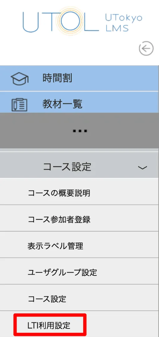 2. 「コース設定」から「LTI利用設定」を選択してください.