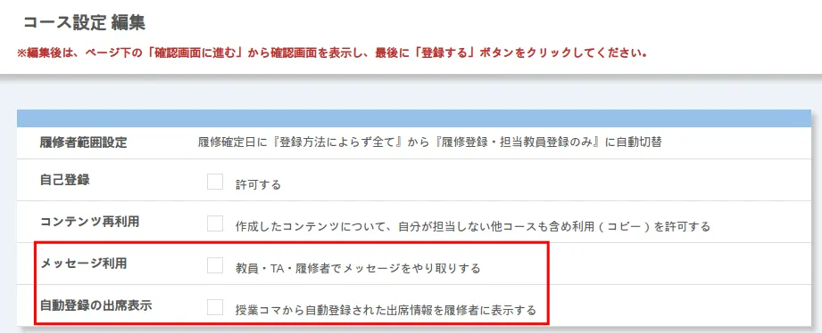 - 「教員・TA・履修者でメッセージをやり取りする」をオンにするとメッセージ機能が有効化されます.