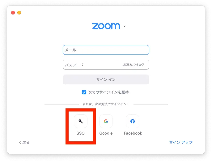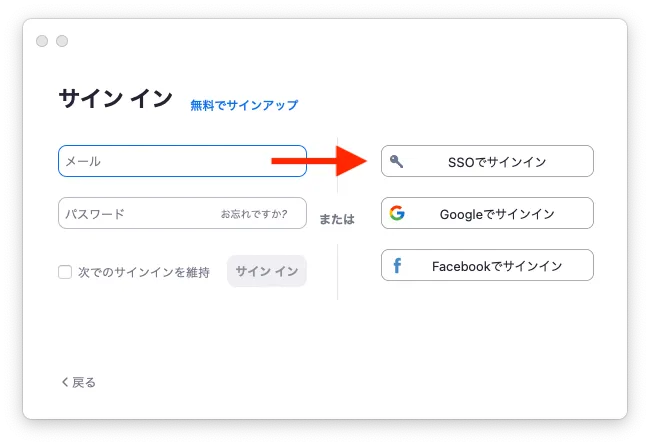 2. サインイン画面で「SSO」,「SSOで続行」,または「SSOでサインイン」と書かれた文字を探して押してください(この画面のメールアドレス・パスワード欄に UTokyo Account の情報を入力してもサインインできません).