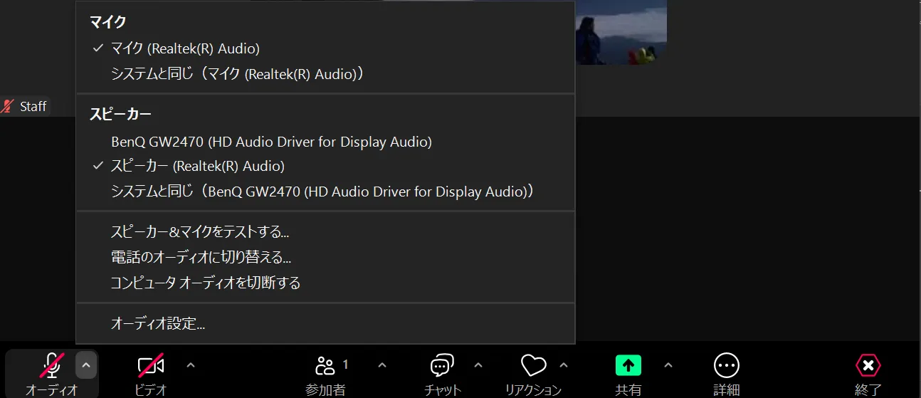 マイクのアイコンの右側の上向き矢印を押すと,追加のメニューが表示されます.「スピーカー & マイクをテストする」というボタンを押すことでテスト機能の画面を開けます.